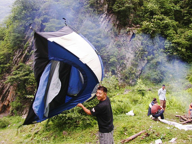 分扎营、柴火、炊事和服务组分头做晚上休息和晚餐准备工作。